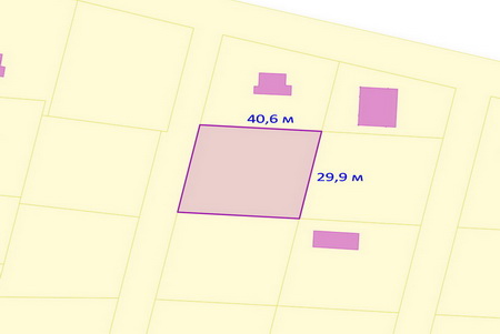 Площадь 12,0 соток, участок ровный, по форме близкой к прямоугольной, размер сторон примерно 30 х 40 м.