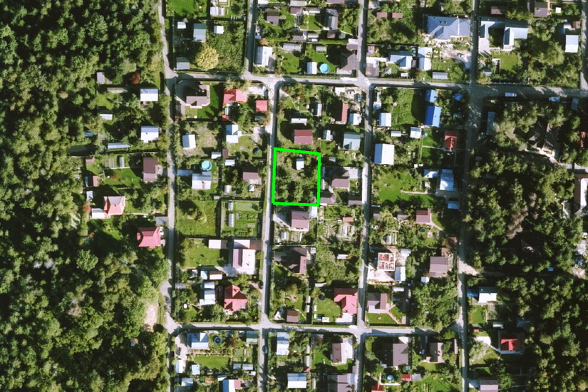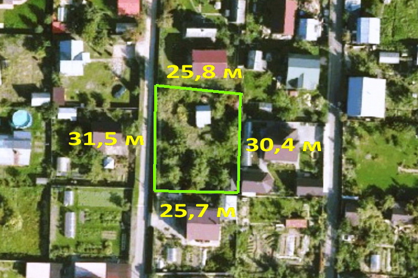 Площадь 8,06 соток, участок ровный, размер сторон примерно 25 х 31 м.